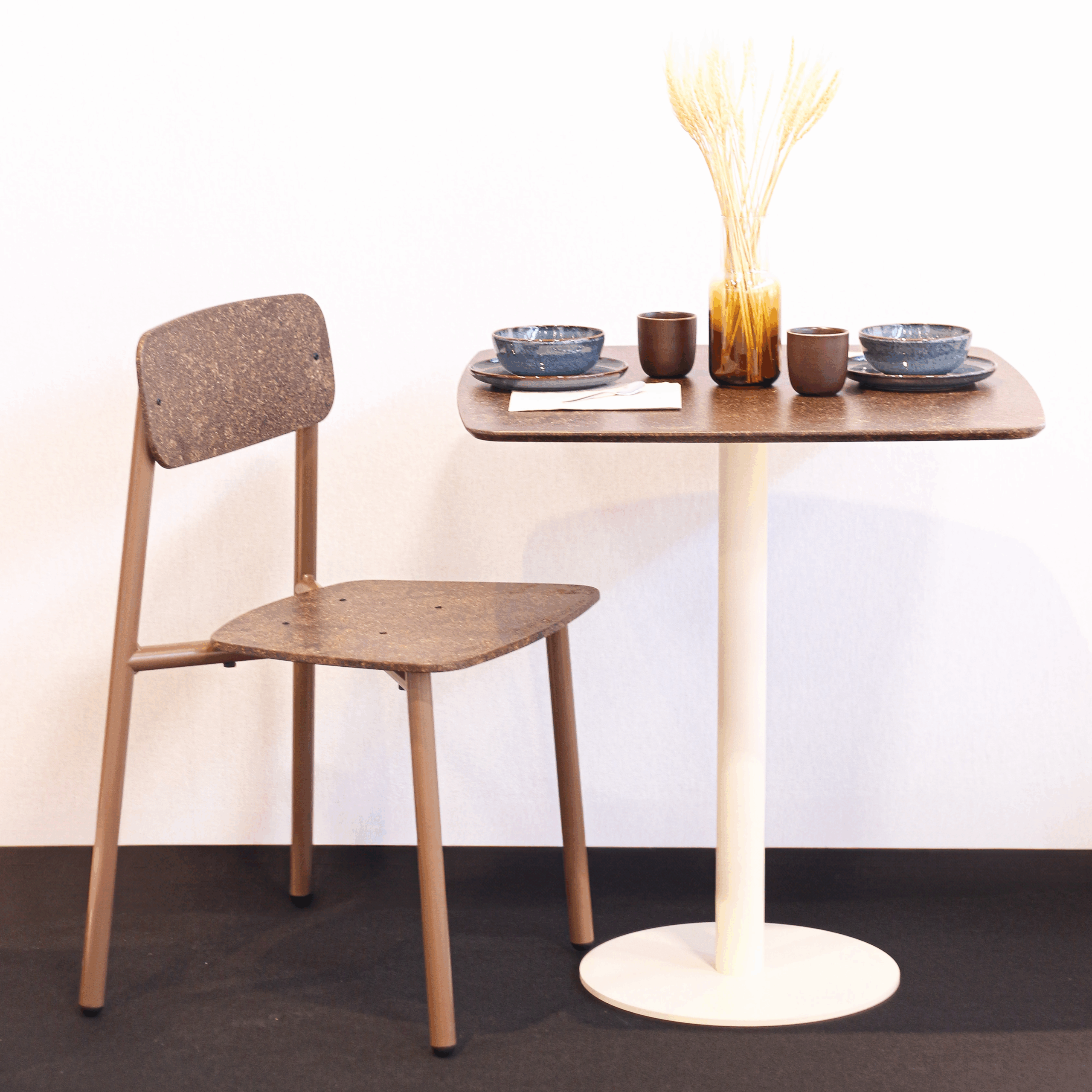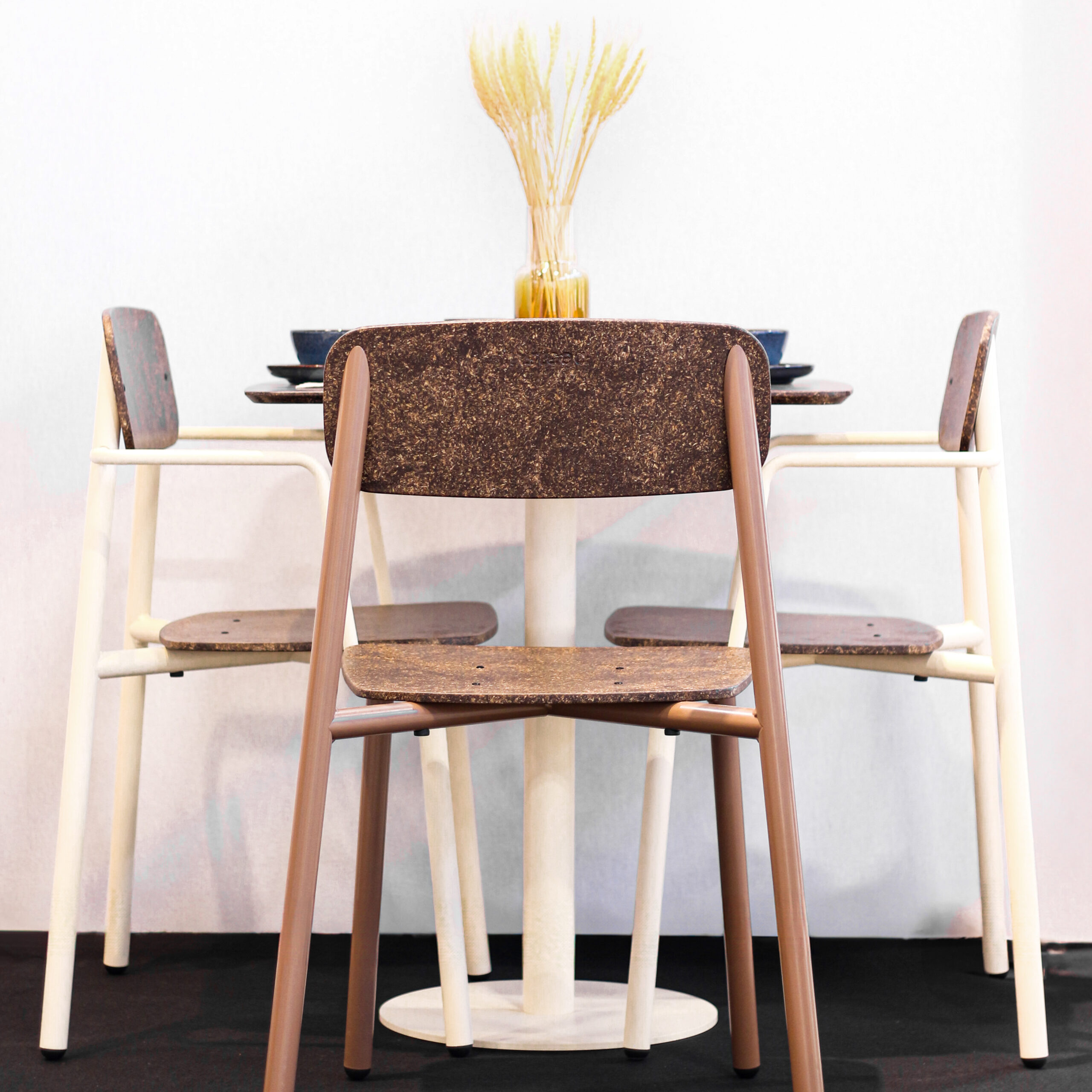 Nous travaillons avec des partenaires locaux pour l’approvisionnement des déchets et matières premières recyclées. Chaque étape du cycle de vie de la chaise Ella est étudiée pour réduire son empreinte carbone et encourager une économie circulaire.